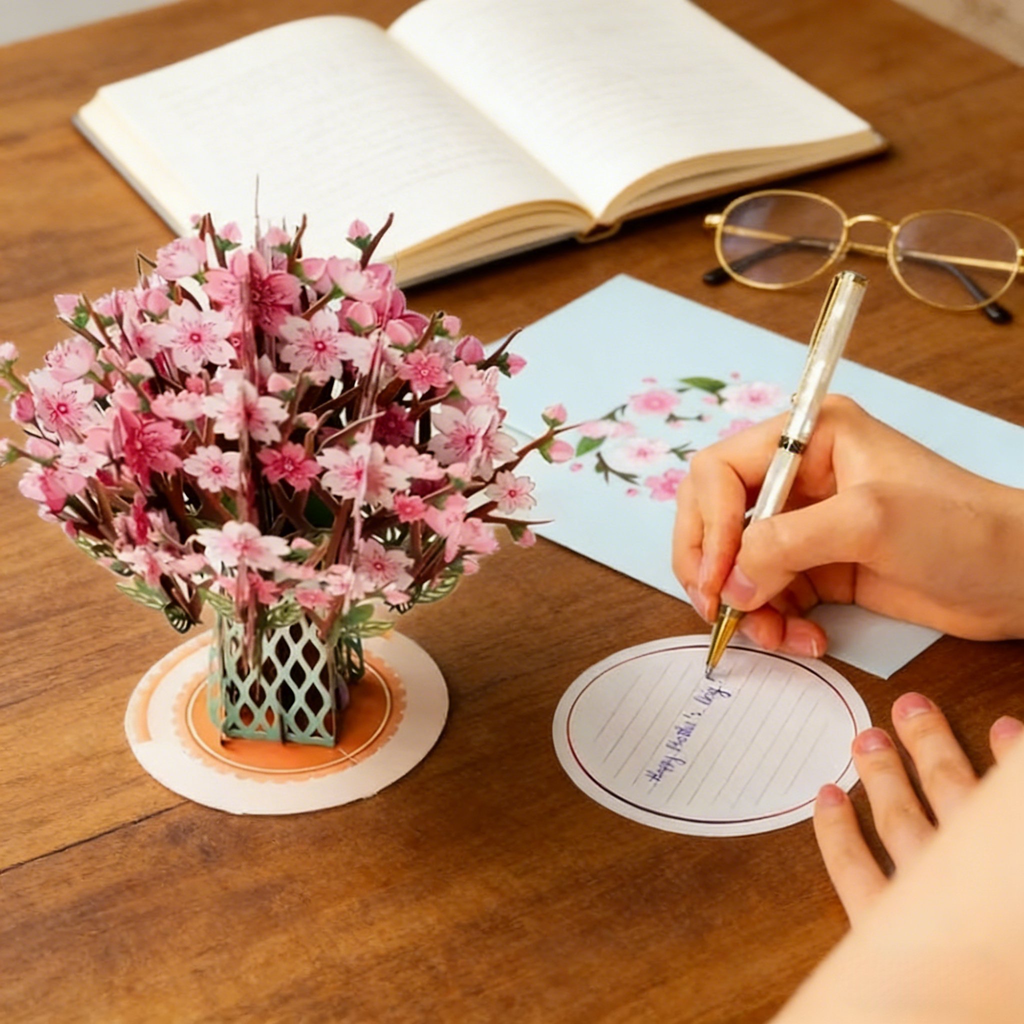 A: When you choose this 3D card with cherry blossoms, you are choosing a unique, artistic alternative to ordinary flat greeting cards. The beautiful 3D design, the symbolic cherry blossom motifs and its dual function as a greeting card and keepsake make this card an exceptional gift. Unlike conventional cards, this pop-up version creates an instant 'wow' factor, conveying your sincere feelings in an unforgettable, creative way – ideal for people who value a distinctive touch to their celebrations.