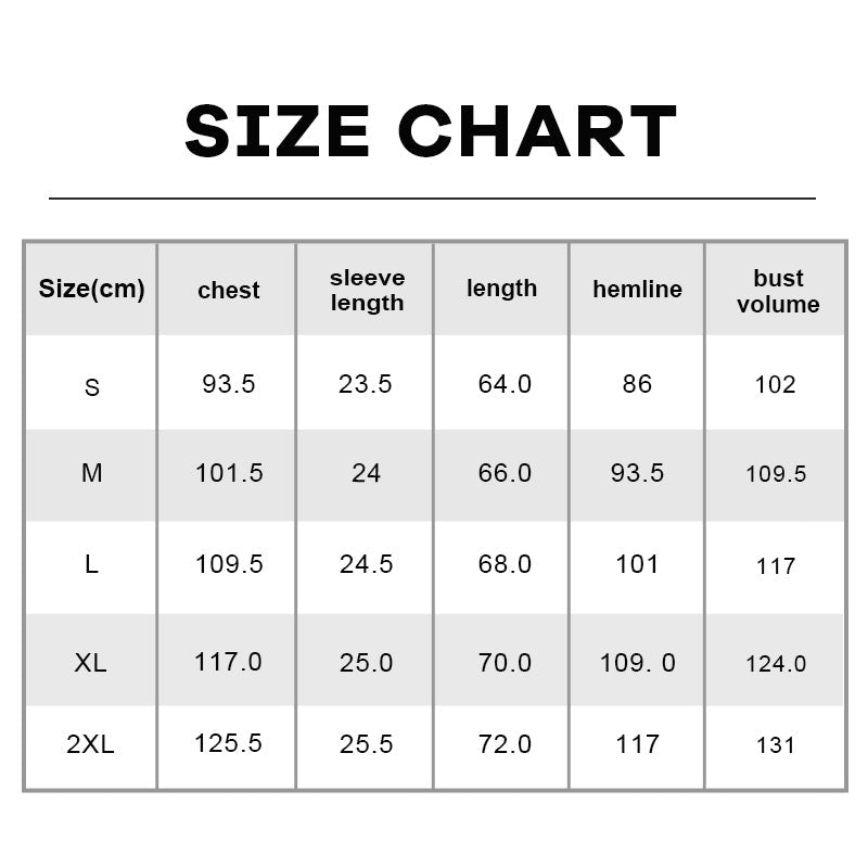 | Size(cm) | chest | sleeve length | length | hemline | bust volume |